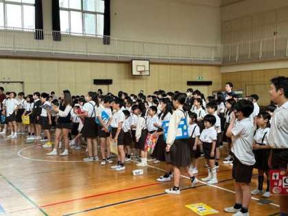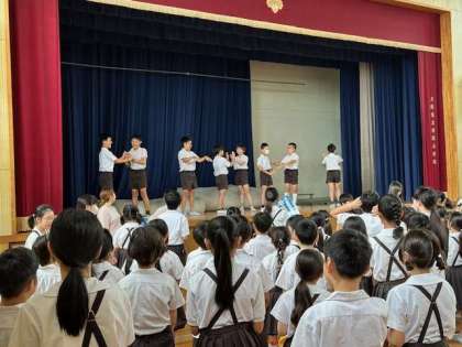 集会委員会の児童がステージでお手本を見せてくれていました。