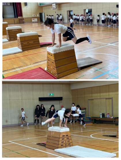 5年生は開脚跳びで助走を工夫しながら跳び越える練習をしています。