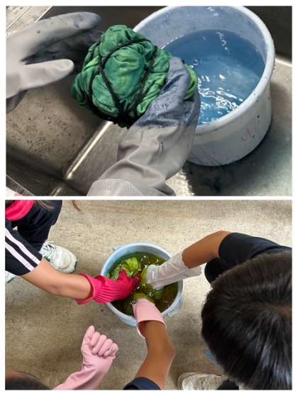 染料を3分間つけた後、隣の子につかないように慎重に絞って、水ですすぎます。