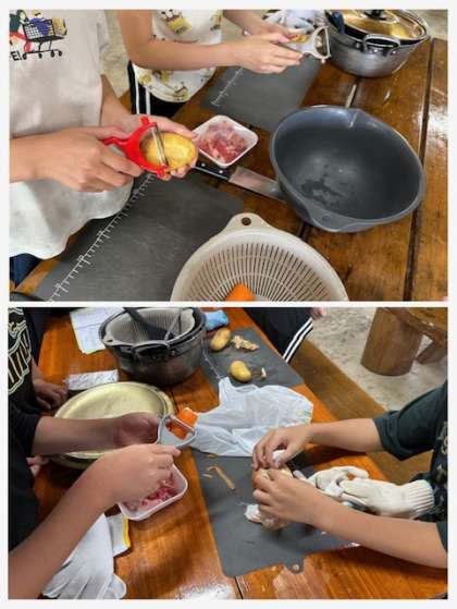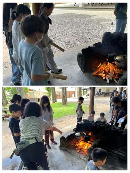 なかなかマッチに火がつかず、ついてもすぐ消えてしまいます。火おこしの大変さを感じながら飯ごう、鍋を温めています。
