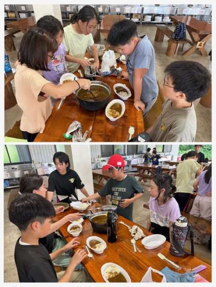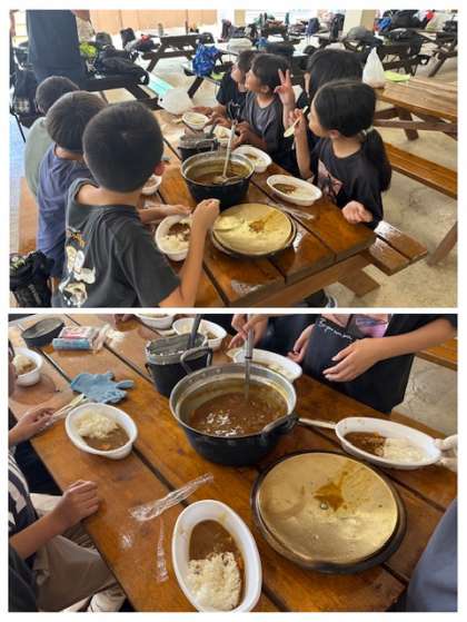 出来上がったカレーライスをみんなで味わいながら食べています。