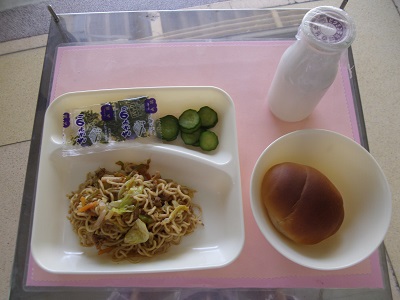 4月11日、給食も始まりました。黒糖ロールパン、焼きそば、きゅうりのしょうがづけ、牛乳です。ソース味の焼きそばに、きざみのりをかけて食べます。子ども達は、おいしく食べていました。