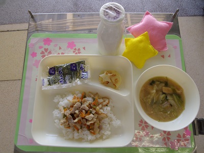 4月14日の給食は、かやくごはん、みそ汁、焼きじゃが、牛乳です。かやくごはんは、具とごはんを混ぜて食べます。焼きじゃがは、給食調理員がじゃがいもを切る時に、星の形に型抜きしたものも全部のクラスに入れました。ラッキーポテトです。子ども達は楽しんで食べていました。