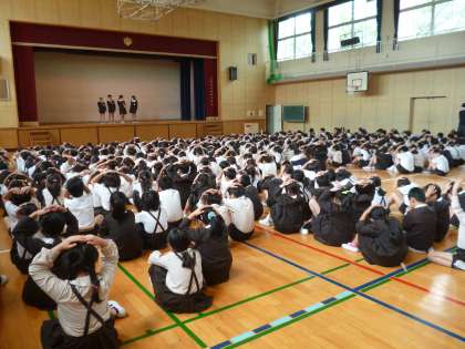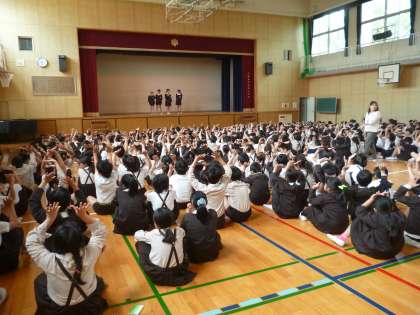 4月28日 本年度最初の集会委員会によるゲームを行いました。「おーちた、おちた」「なあにがおちた」の掛け声のあと、落ちたものの名に合わせて素早くポーズをします。1年生にとっては、初めての集会でしたが、担当の児童の言葉にのって、リズムよくポーズをとって楽しんでいました。