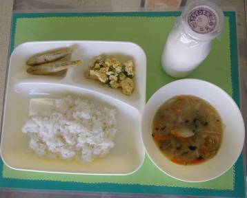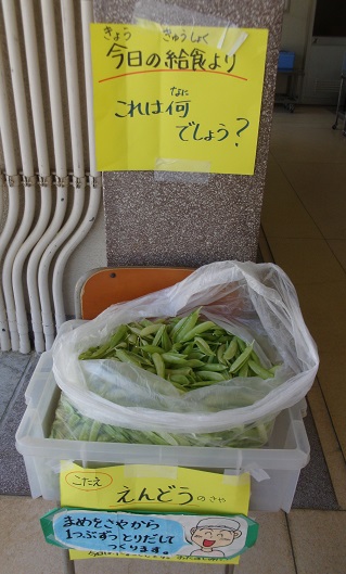 5月12日の給食は、ごはん、きびなごてんぷら、みそ汁、えんどうの卵とじ、牛乳です。えんどうの卵とじは、旬のえんどうを使用した春を感じる献立です。給食室の前に、給食調理員が豆を取り出したさやを、展示して紹介しています。また、卵アレルギーの児童には、卵除去食の個別対応もしました。子ども達は、えんどうの香りや食感を楽しんで食べていました。