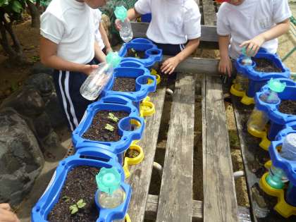 5月16日 先週、あさがおの種まきをして6日目、発芽をしていたりふた葉になっていたりしています。1年生の子どもたちがうれしそうに水やりをしていました。芽をだしたばかりの小さなあさがおの葉に「かわいい。」といって世話をしているようすはとてもほほえましいです。