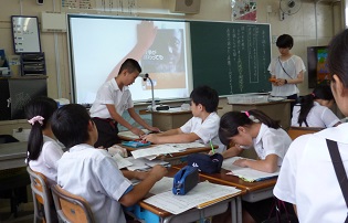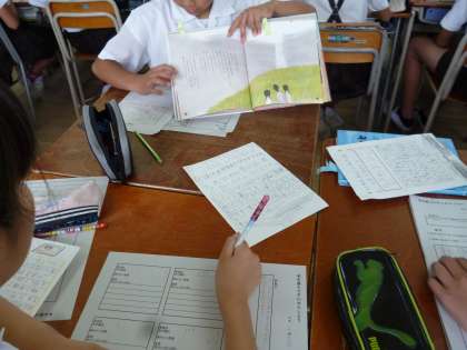 6月7日 「ヒロシマのうた」という教材文を読み、主人公の気持ちに寄り添いながら読みを深めていきました。それと同時にこの本に関連する本を何冊か並行読書をし、その中から推薦する本を選び、交流会をもちました。OHCの機器をうまく活用してみんなに披露しました。それぞれの考えをしっかりもち、意見交換していました。