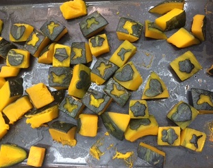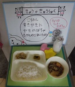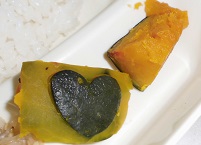 6月13日の給食は、ご飯、すき焼き煮、もやしのごまいため、焼きかぼちゃ、牛乳です。今回の焼きかぼちゃは、旬のかぼちゃをシンプルに塩で下味をつけ、蒸し焼きにしています。そして、給食調理員が、かぼちゃの皮にハートや星、ちょうちょの形に切り抜いて、ラッキーかぼちゃにしました。各クラスに2つずつ入れました。子ども達は今日も楽しく、おいしく食べていました。
