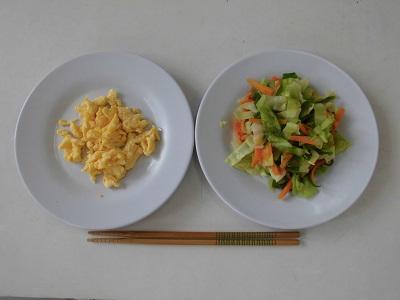 6年生が、家庭科の学習で、調理実習をしました。自分で作ったエプロンを身につけて、スクランブルエッグと三色野菜いためを作りました。野菜を一生懸命切ったり、卵をいためて、かたまっていく様子を楽しんだりしていました。