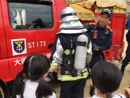 実物の消防車も、来てくれました。子どもたちは間近で見る消防車に、大きな歓声をあげました。消防車の重さが6トンもあることや、搭載している水の量、ホースの長さや防火服について調べたり観察したりしました。