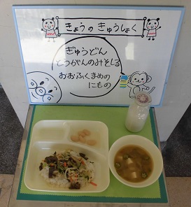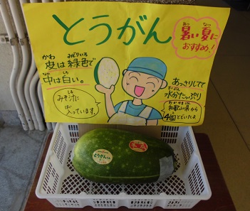 7月6日の給食は、牛丼、とうがんのみそ汁、大福豆の煮もの、牛乳です。とうがんは水分たっぷりで、夏の体におすすめの野菜です。給食室には、和歌山県や岡山県で作られたものが4個届きました。給食調理員が1個だけ中身をくりぬいて、給食室の前に展示しました。子ども達は興味深々。パクパク食べていました。