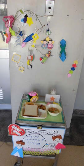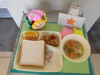 7月7日の給食は、食パン、りんごジャム、パエリア、じゃがいものスープ、オレンジ、牛乳です。給食調理員が子ども達に楽しく食べてもらいたいという願いをこめて、ラッキー給食にしました。スープには、星の形に型抜きしたラッキーにんじんとラッキーじゃがいも、パエリアには、ラッキー赤ピーマンを入れました。大好評でした。