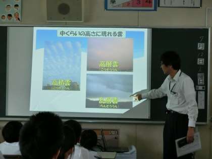 7月12日 大阪管区気象台より二人の方が来校され、雲の様子や成り立ち、大雨や雷、竜巻の恐ろしさと避難のしかたを教えていただきました。DVDをみた後、ワークシートにかかれてある問題を考えたり話し合ったりして、正しい避難のしかたを学習していきました。