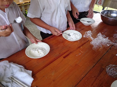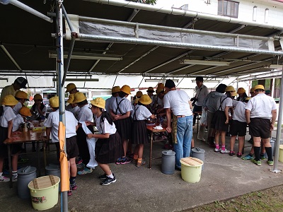 7月22日 林間学習の最後のプログラム「アイスクリーム作り」です。この3日間で班活動の大切さを学んだと思います。みんなで力を合わせてホイップしたり転がしたりして手作りアイスクリーム堪能し、おいしく試食しました。