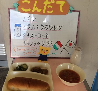 大阪市は今年、イタリア・ミラノとの姉妹都市提携35周年をむかえました。10月7日の給食はそれを記念した献立でした。レーズンパン、ミラノ風カツレツ、ミネストローネ、きゅうりのサラダ、牛乳です。子ども達に、おいしいと好評でした。