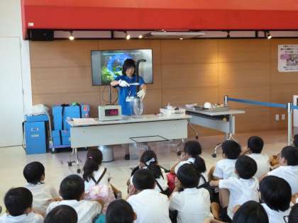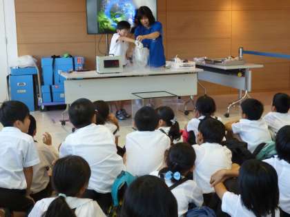 10月7日 生活に欠かせないエネルギーであるガスはどのようにして運ばれてくるのか、安全性については・・・など楽しい展示物をみながら説明を聞いたりクイズに答えたりしながらエネルギーについて考えました。また、−196度の液化窒素を使った冷却実験では、驚きと発見をみせていました。