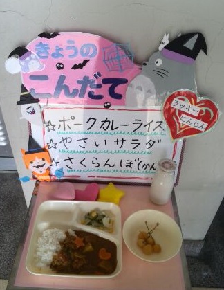 10月14日の給食は、ポークカレーライス、野菜サラダ、さくらんぼ(缶)、牛乳です。10月のポークカレーライスは、小麦アレルギーの子ども達も食べられるように、米粉のカレールウの素を使用しています。また、給食調理員が、にんじんをハートと星の形に型抜きして、全部のクラスに数枚入れました。クラスでは楽しく喜んで食べていました。着色料を使用していない黄色の缶づめのさくらんぼも好評でした。