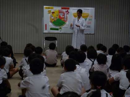 10月20日 地域のスーパーマーケットから栄養士さんが来校され食育を学習した後、マーケットの見学をしました。普段みることのできないバックヤードのところまで見学させていただきました。魚や、惣菜の調理をしているところ、食品の運搬しているようす、商品の陳列などを見学して働いている人のようすやマーケットの役割や工夫を学習しました。特に冷凍食品を保管する大きな冷凍庫(−20度)の中に入られせていただいた体験は驚きと楽しさがあったようです。