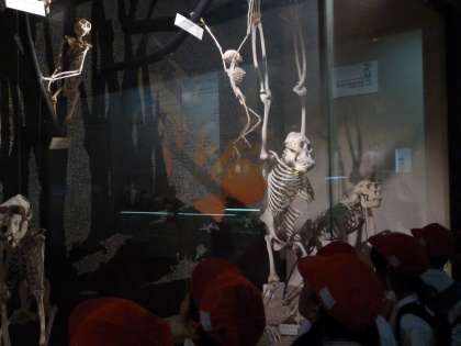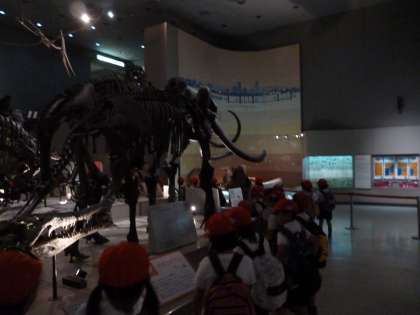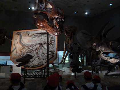 10月21日 長居公園内にある『自然史博物館』を見学しました。恐竜の骨格や動物のはく製など興味深く展示物を見学していました。実物大の前に立つと「でっかい!」と見上げながら驚いていました。