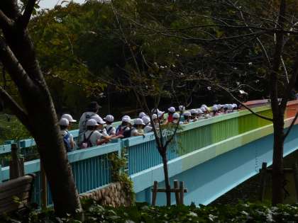 10月21日 長居公園内の植物園では、どんぐりを見つけたりきれいに咲いていたバラを眺めたりみんなで楽しくお弁当を食べたりしました。大池にかかる橋から池にいるハクチョウや鯉、カメをみて見てゆったりとした時間を過ごしました。小さな広場では、鬼ごっこやはないちもんめ等をして楽しい時をみんなで共有しました。