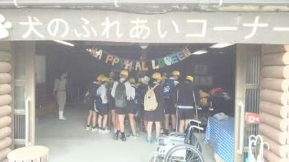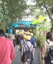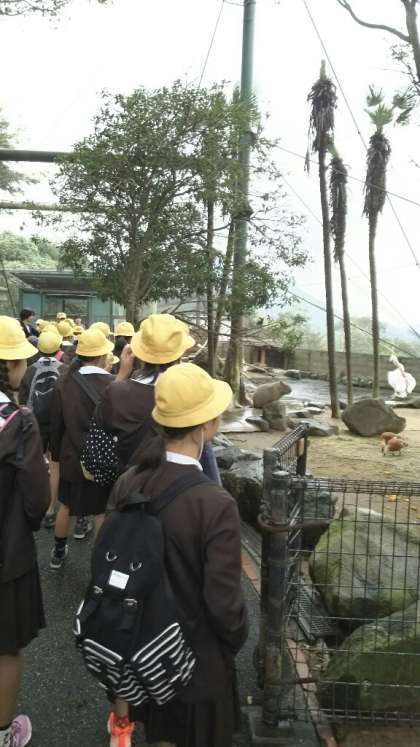 バスから降りて次は、ウォーキング サファリです。園内を歩いて動物たちと出会います。楽しくグループ活動をしています。