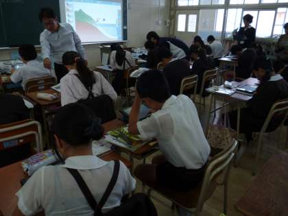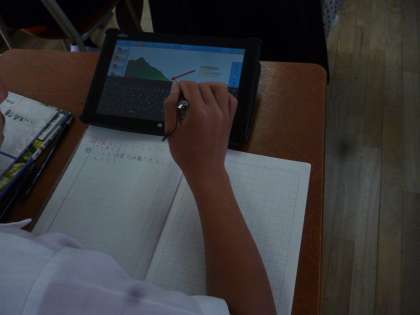11月1日 理科「地層のでき方を考える」学習で、タブレットを使いながら地層がどのようにできたのか自分や友だちと話し合いました。タブレットに送られたプリントにタッチペンを使って考えを書いていき、書かれたプリントをスクリーンに提示して発表していきました。さすが6年生。タブレットの使い方には手馴れていました。