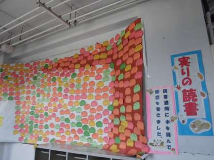 10月27日から11月9日の読書週間中に多くの子どもたちが図書室に来て読書を楽しみました。その期間に本のひと言感想を書いた子どもたちは『のべ517人』もいました。図書委員会の人たちも大忙しの図書館開放でした。