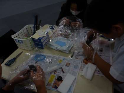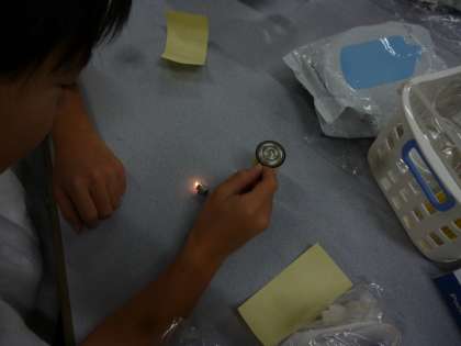 11月17日 守口市にある乾電池工場で手作り乾電池を体験しました。身近に使用しているマンガン乾電池作りです。二酸化マンガンを亜鉛缶にいれ、炭素棒を差し込んでいく作り方ですが、子どもたちは慎重に丁寧に製作していました。オリジナルのラベルを貼って完成です。みんなでまめ球を点灯したらとてもきれいで歓声があがっていました。