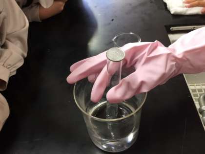 試験管の口にシャボン液で膜を張らせ、お湯を入れたビーカーに入れ、「中に閉じ込められた空気」を温める実験をしました。すると……?
