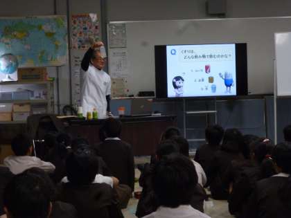 11月24日 薬剤師さんを招いて薬の正しい使い方を学習しました。「飲用するときのタイミングや水以外では飲用しないようになど」の気をつける点を教えてもらいました。成人する20歳までは体の成長からアルコールの飲用・たばこの吸引をしてはいけない話を聞きました。子どもたちはみんな真剣に学習していました。