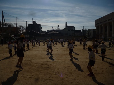 今週は低学年のなわとび週間です。20分休み、元気に運動場で練習をしています。高学年の運動委員会の人たちがクラスの前に立ち、見本をみせたり支援したりしてやさしく教えています。うまく跳べたときは「できた!」とうれしそうに練習を繰り返しています。