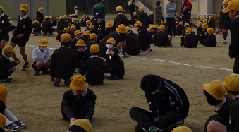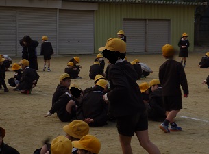 1月19日 集会委員会による「ハンカチ落とし」ゲームをしました。ハンカチの代わりに玉入れの紅白玉を使い、たて割り班でなかよく楽しみました。同じ学年には玉を落とせないルールがあります。高学年がやさしく玉を落としていたり、タッチをしているようすは、とてもほほえましいでした。
