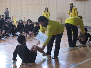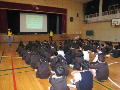 3学期の土曜授業では全校で避難訓練をしました。今回は、地震発生の後、津波警報が発令された想定で行いました。教職員の指導の下、ルールを守って訓練できました。4年生はこの日の1時間目に防犯教室を実施し、東成警察と区役所の方から不審者から身を守る方法を教えてもらいました。