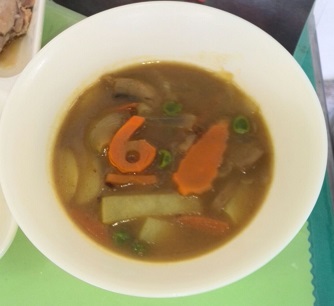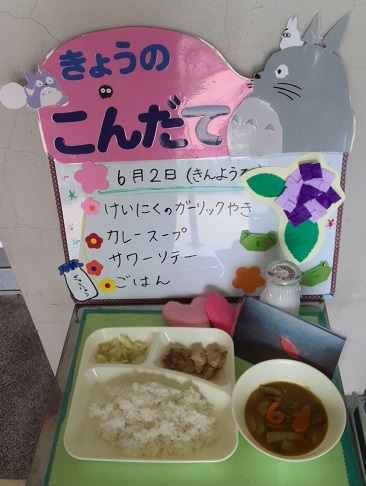 6月2日の給食は、米飯、鶏肉のガーリック焼き、カレースープ、サワーソテー、牛乳です。暑くなってきて、食欲も落ちやすい時期なので、給食調理員が新しい形のラッキーにんじんを考えてみました。6月にちなんで「6」という形を包丁で作ってみました。そして葉っぱも型抜きで作って、全部のクラスのカレースープに入れました。子ども達はビックリして喜び、楽しんで食べていました。