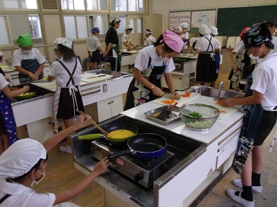 6年生が家庭科で、朝食について学習し、調理実習をしました。自分で作ったエプロンを身につけて、スクランブルエッグと三色野菜いためを作ります。切り方や火加減、調味のしかたを工夫して、おいしくつくることができました。また家でやってみたいと話していました。