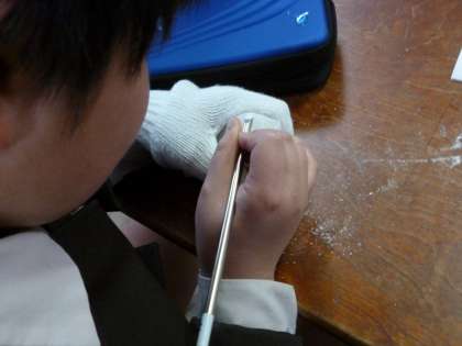 5年生が篆刻(木や石などの印材に文字を彫ること。習字などの書に押している印などに使う)をしました。石に文字を刻んでいくことはもちろん初めてですから子どもたちは悪戦苦闘でしたが立派な作品ができました。