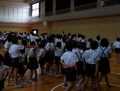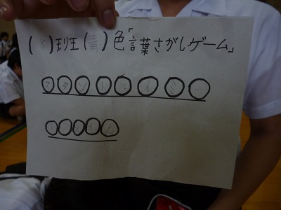 集会委員会による「言葉さがしゲーム」でした。集会委員会のメンバーが、13文字のカードを事前に体育館のある場所に貼っておきました。そのカードをたてわりり班のグループでさがして言葉にしていきました。『ドラえもん』の5文字は容易に並びかえることができたようですが、残りの文字を言葉にするには難しいようでした。正解の発表があった時「あ、そうか!」とどよめきがありました。楽しい集会でした。