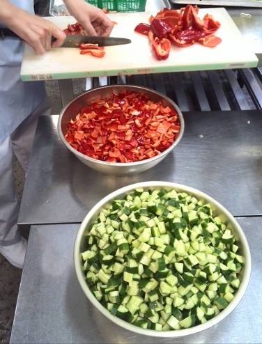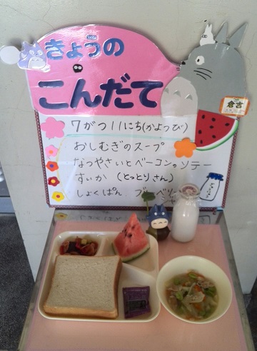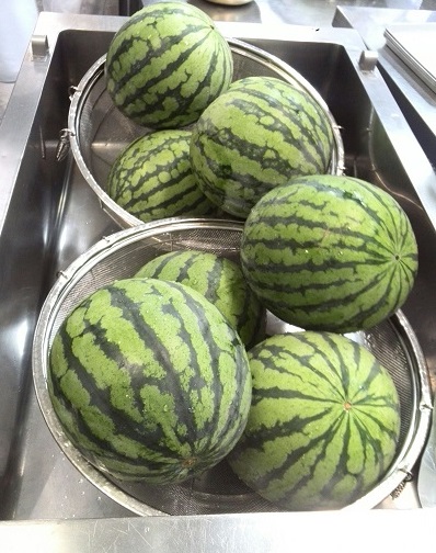 7月11日の給食は、食パン、ブルーベリージャム、押し麦のスープ、夏野菜とベーコンのソテー、すいか、牛乳です。夏野菜は、なす、きゅうり、トマト、赤ピーマンです。オリーブ油でいためて、砂糖、塩、こしょう、ワインビネガーで味つけしました。暑い夏に食べやすいさっぱりとした味になりました。すいかは鳥取県で作られたものが8玉届きました。給食調理員が先が折れないように気をつけて、1人分1/64に切りました。子ども達に甘くておいしいと好評でした。