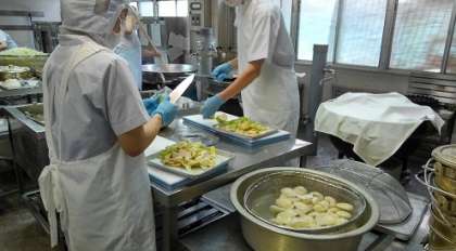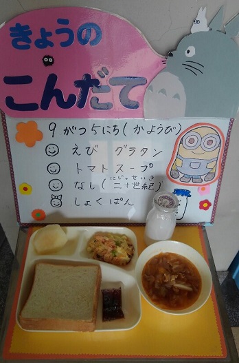 9月5日(火)の給食は、食パン、いちごジャム、えびグラタン、トマトスープ、なし(二十世紀)、牛乳です。秋が旬のなしは、1人1/4切れずつです。神路小学校には、鳥取県産のなしが、123個届きました。子ども達が食べやすいように、給食調理員が全学年の分の芯をとり、皮をむき、塩水につけ、クラスごとに数えて提供しました。子ども達はおいしいと、パクパク食べていました。