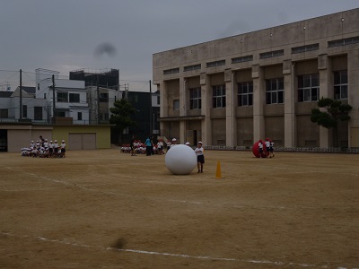 はじめて、大玉をころがしての練習をしました。3人のいきがうまく合わなくて進みにくいチームやコーンでの折り返しに苦戦しているチームなどがありましたが、先生たちの指導のもと、だんだんスムーズに進めるようになってきました。本番が楽しみです。