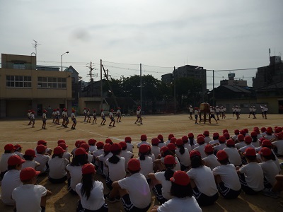 応援合戦の練習をしました。応援団の動きとかけ声に合わせてみんな声をそろえたり手拍子を合わせたりして本番に向け練習をしました。ウェーブを作るのにうまく合わないところを何度かくりかえしました。だんだんと合うようになり大きなウェーブとなって応援合戦が盛り上がってきました。
