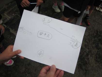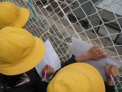 3年生の社会科は自分たちの住んでいる町や市について学習します。自分たちの住んでいる町を調べる学習のために、校舎の屋上に上がって町の様子を見ました。先生から町を見るポイントを教えてもらい、4方位ごとに町の様子を調べました。