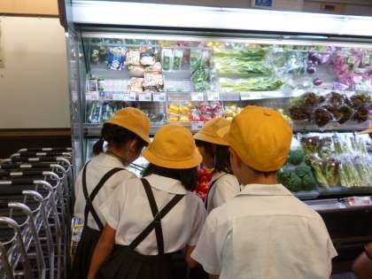 3年生の社会科学習で「食育体験ツアー」を行いました。はじめに、学校にて食育インストラクターによる、三色食品群と食事バランスガイドについての講義を受けました。その後、校区内のスーパーマーケットに見学に行きました。店内やバックヤードの様子を見せていただきました。買い物体験で課題に合った野菜を選び、実際にレジで支払もしました。お店の工夫やひみつに子どもたちも興味津々で学習することができました。