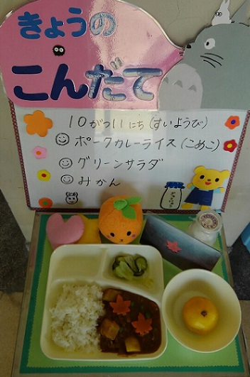 10月11日の給食は、ポークカレーライス[米粉]、グリーンサラダ、みかん、牛乳です。ポークカレーライスは、小麦アレルギーの子ども達も食べられるように、米粉のカレールウの素を使用しています。また、給食調理員が、にんじんを、もみじの葉の形に型抜きして、全部のクラスに数枚ずつ入れました。