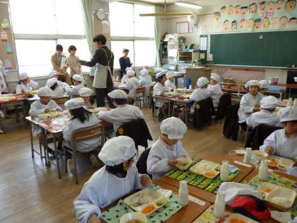 4月25日(金)今年度初めての学習参観・懇談会を行いました。1年生は給食参観でした。当初にくらべ、当番活動にもなれてきたようで配善もうまくできるようになってきています。他学年も算数・国語・社会の学習に緊張しながらも熱心に取り組んでいました。