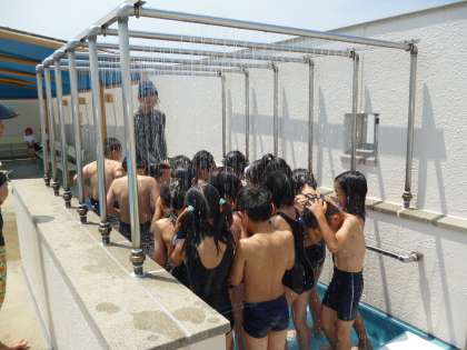 6月17日にプール開きをしました。暑い日が続いているので、子どもたちは大喜びです。この日を前に、教職員は東成消防署の協力を得て救命救急講習を受けました。また、前週には教職員と6年生がプールの掃除をしてきれいにしました。安全に気を付けて泳力をつけていきたいと思います。