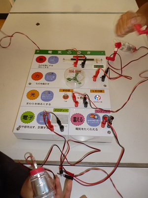 関西電力の方に来ていただき、自分たちが毎日使っている「電気」について学習しました。昔と今では電気のあるなしでくらしが随分変化したことを調べ、電気の必要性を子どもたちは感じました。また、電気がどのようにつくられ、くらしの中まで辿ってくるのか「電気の道」も教えていただきました。手動の発電機で電気をつくる大変さを実体験したり、みんなで手をつないで電気を通してみたりして、楽しく学習に取り組めました。