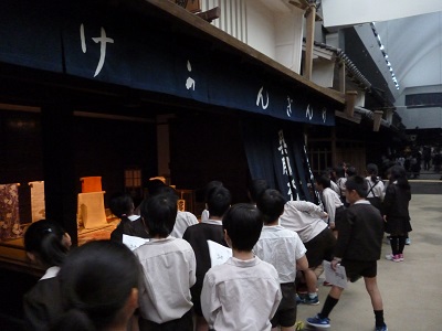 社会見学で「今昔館」に行き、見学をとおして、昔の大阪のくらしや町並みのうつりかわりを体験学習しました。提示された昔の道具の使い方を考えたり答えたりして興味関心をもって取り組みました。「せっちんって何かな」「五右衛門風呂はどこにあったかな」など学習カードをみながら町並みをまわって見学していました。