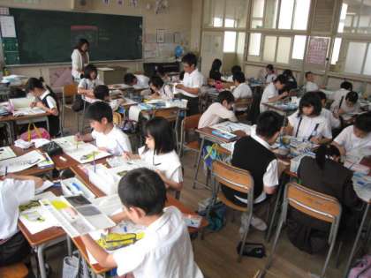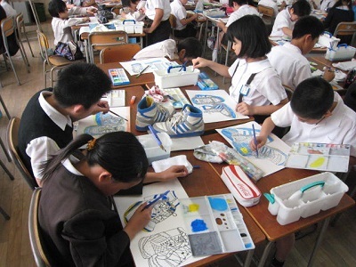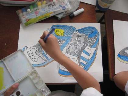 5年生の教室を見ると、子どもがいるのに、まったく話し声が聞こえません。今日は図工で線描の学習をしていて「くつ」の絵をかいていました。とっても丁寧でびっくりしました。