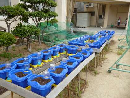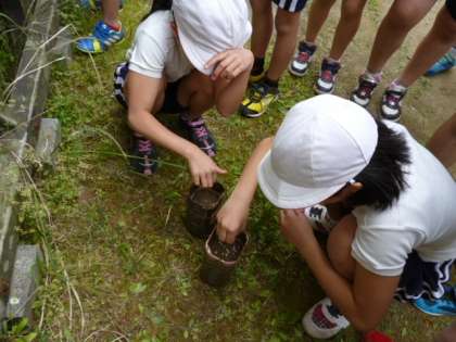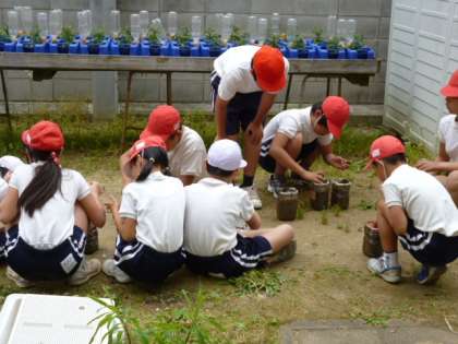1年生が「あさがおの種うえ」を、5年生は「米づくりのための籾まき」をしました。一人一鉢育てます。夏にたくさんの花や実がつくよう世話をし、観察していきます。お家でも声をかけ、話を聞いてみてください。